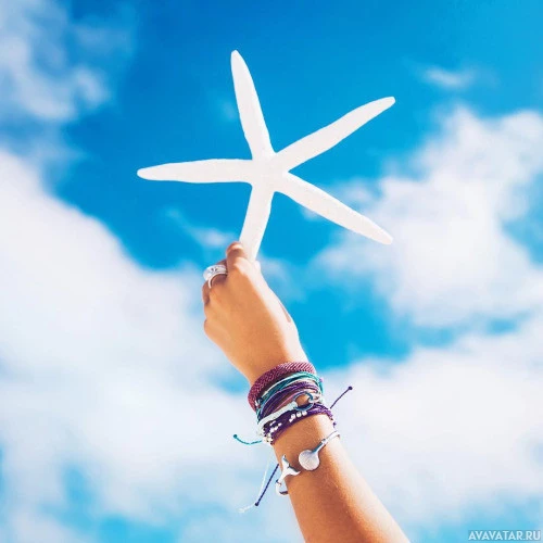 The picture features a person's hand holding two starfish shapes in the sky. The background is clear with some clouds, suggesting it might be