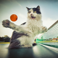 tennis ball. This scene is humorous and whimsical, as it portrays a feline engaging in