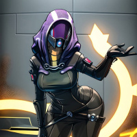 The image features an animated character from the Mass Effect video game series. This character is Tali, known for her purple cloak and her role as a young prodigy with cybernetic enhancements. The style of the image suggests it might be from a comic or graphic novel related to the Mass Effect universe.