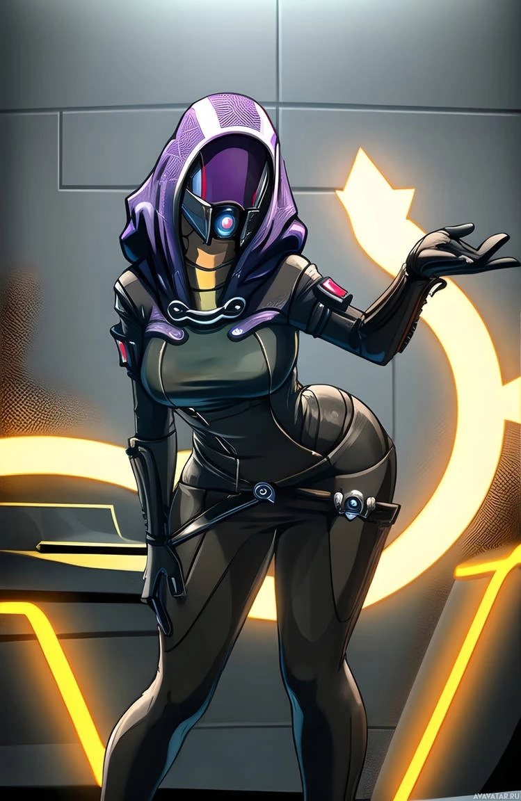 На картинке изображен анимированный персонаж из серии видеоигр Mass Effect. Этот персонаж — Тали, известная своим фиолетовым плащом и ролью молодого вундеркинда с кибернетическими улучшениями. Стиль изображения предполагает, что это может быть комикс или графический роман, связанный со вселенной Mass Effect.
