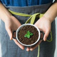 a small pot with soil in one hand and what appears to be a seedling sprouting from the soil in the other hand. The person is wearing an apron, suggesting they might be involved in gardening or