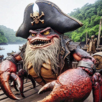 The picture features a crab dressed as a pirate, complete with a pirate hat and bandana. It's an unusual and humorous depiction of the animal wearing pirate attire.