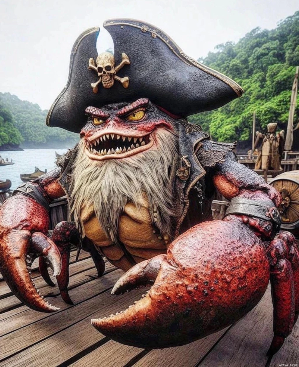 На картине изображен краб, одетый как пират, в комплекте с пиратской шляпой и банданой. Это необычное и забавное изображение животного в пиратском наряде.