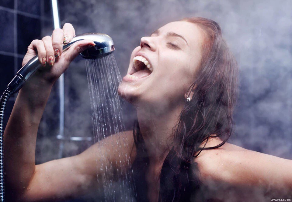 a shower head, with her eyes closed as if she is in mid-shower. She appears to be singing or shouting out loud, possibly expressing joy or energy during