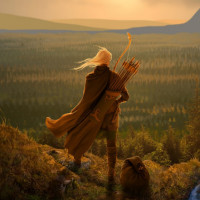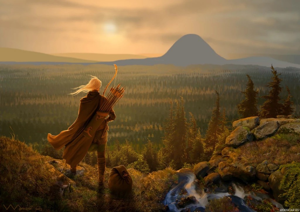 fantasy settings. In front of them is a bow, suggesting they may have just shot or are about to shoot an arrow. The setting is a tranquil natural landscape with