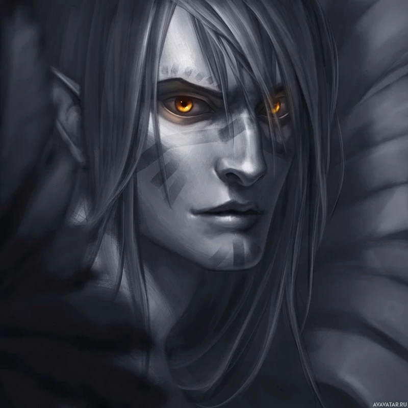 a fantasy setting, possibly inspired by the Drow race known in the Dungeons & Dragons (D&D) universe. This character has striking features such as pointed ears, yellow eyes, and elongated eyebrows, which are characteristic of Drow portrayals in