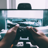 video games. The scene suggests that the individual is engaged in an interactive video game, possibly involving shooting or combat due to the positioning of their hands on the controllers.