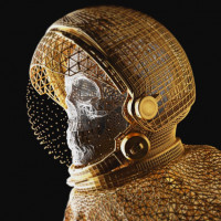 На картинке изображен шлем астронавта золотого цвета с лицом человеческого черепа. Это создает интригующее противопоставление между жизнью и смертью или, возможно, символически представляет смертность в исследованиях или космических путешествиях. Использование золота придает ему экстравагантный или заветный вид.