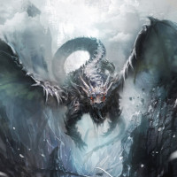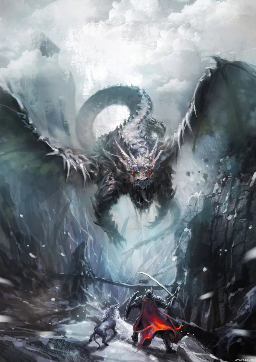 the body of a dragon. The background suggests a snowy mountainous environment, which adds to the epic and