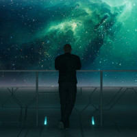 The image features a silhouette of a man standing in what appears to be the interior of a spaceship or spacecraft. Through the window, we can see a breathtaking view of a vibrant nebula or galaxy outside. The atmosphere is one of contemplation and awe, as if the person is taking a moment to admire the cosmic vista before him.