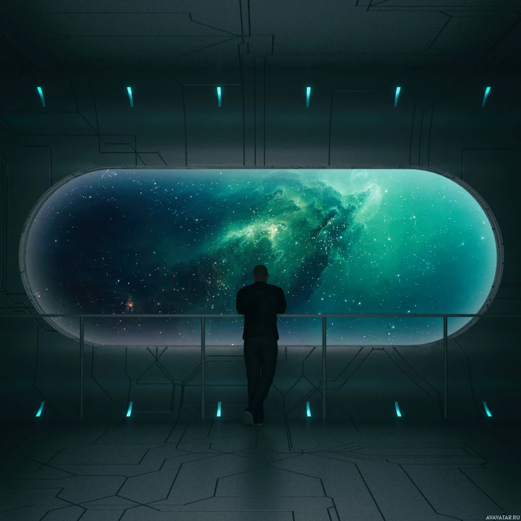 На картинке изображен силуэт человека, стоящего внутри космического корабля или космического корабля. Через окно мы можем увидеть захватывающий вид на яркую туманность или галактику снаружи. Атмосфера — это атмосфера созерцания и благоговения, как будто человек делает мгновение, чтобы полюбоваться космической перспективой перед ним.