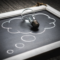thought bubbles, suggesting ideas or thoughts. On top of the chalkboard, there is an actual