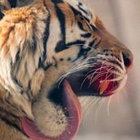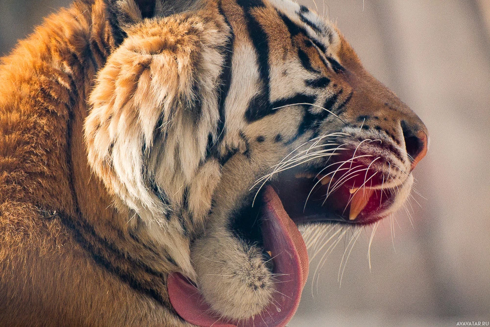 На картинке изображен тигр с широко раскрытым ртом, как будто он ревет или стучит. Вы можете четко видеть язык и зубы тигра из-за угла крупным планом выстрела.