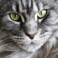 На картинке изображена кошка. У кошки поразительные зеленые глаза и белая грудь с более темным серо-коричневым мехом на голове, спине и лапах. Кажется, что он отдыхает или сидит в удобном положении с передними лапами, спрятанными под его телом.