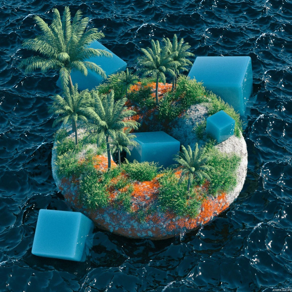 palm trees and greenery, giving it a tropical appearance. Surrounding the island are several blue cubes of