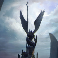 The image depicts a fantasy scene with a prominent statue or figure on a rocky outcropping that resembles a dragon's head. The figure has wings and is holding what appears to be a staff or weapon, suggesting it might represent a character of importance in the context of this fantasy setting. The background suggests a moody or dramatic environment with cloud formations that contribute to the mystical atmosphere of the image.