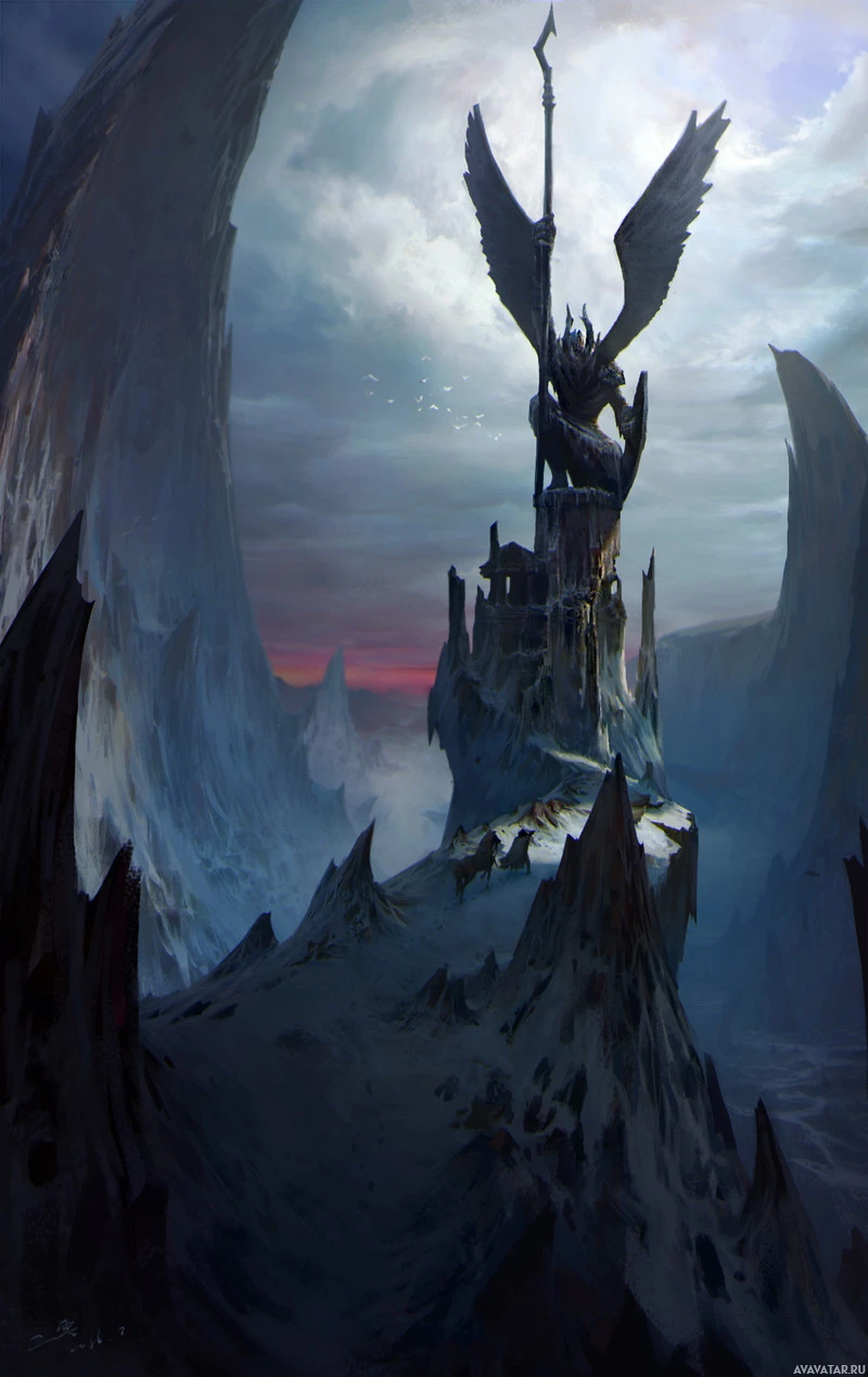 На картинке изображена сцена фэнтези с видной статуей или фигурой на скалистом обнажении, напоминающем голову дракона. Фигура имеет крылья и держит то, что кажется посохом или оружием, предполагая, что это может представлять собой важный персонаж в контексте этой фэнтези. Фон предполагает угрюмую или драматическую обстановку с облачными образованиями, которые способствуют мистической атмосфере образа.