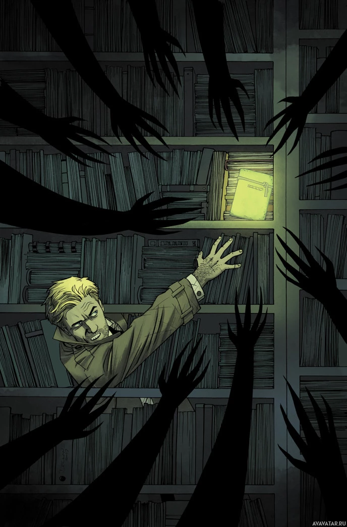 the numerous books and the architectural features around him. The scene is quite dramatic, suggesting a storyline where the protagonist may be trying to escape or rescue someone while being surrounded by supernatural elements or possibly hallucinations.