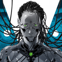 long hair and green eyes, giving it a lifelike quality. The robot's skin is metallic and adorned with circuit-like patterns. It appears to be depicted in