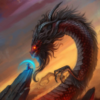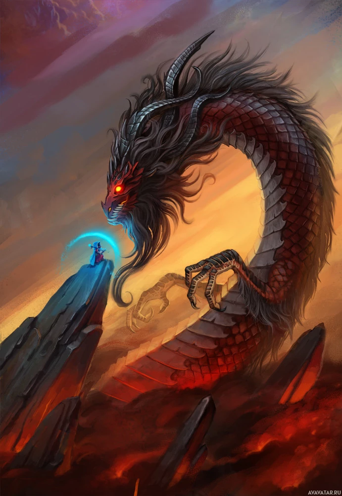 The image depicts a fantasy-themed scene featuring a dragon and a character standing on rocks. The dragon has a menacing appearance with sharp teeth, fiery eyes, and an elaborate, long mane of