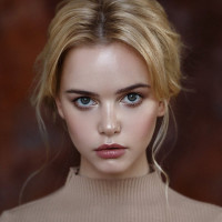 The picture shows a young woman with blonde hair and blue eyes. She is wearing a turtleneck sweater and looking directly at the camera with a neutral expression.