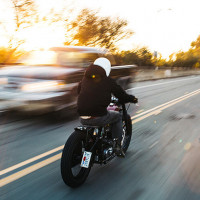 The image shows a person riding a motorcycle from behind. The motorcyclist is wearing