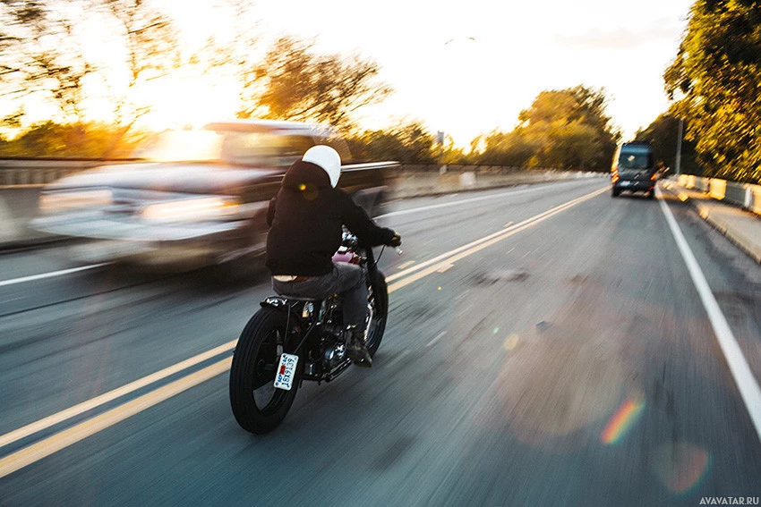 protective gear, including a helmet and what appears to be a leather outfit or jacket. The setting is an urban street during sunset or early evening, as indicated by