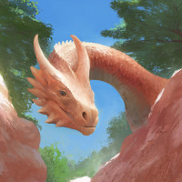 a fantastical scene featuring a dragon. The dragon is prominently positioned in the center of the frame, showing its head and part of its body peeking out from behind some