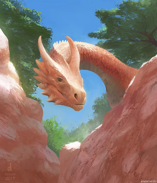 rock formations. It has scales that appear to be tough and reptilian, with horns on its head, adding to its mythical appearance. The background consists of