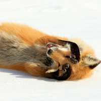 a red fox lying on the snow with its body stretched out. It appears to be in motion, possibly playing or running through the snow. The fox's fur is prominent and it looks like it could be an adult based on size and coloring. The background is white, suggesting that this photo was taken in