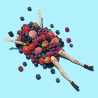 The image shows a doll lying on its back with its limbs splayed outwards, as if it is relaxing. On top of the doll's torso and arms are various berries, including strawberries and blueberries, creating a colorful fruit pattern that mimics a person wearing fruit like clothing. The background is a solid light blue surface, providing a clear contrast to