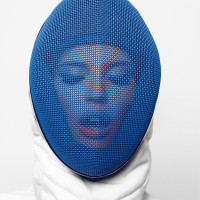 type of attire might suggest a thematic or artistic expression related to protection, safety, or anonymity, given the coverage it provides. The person has their eyes closed, which could be interpreted in various ways, such as focusing on senses other than sight, experiencing