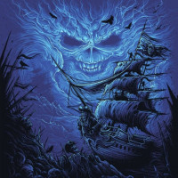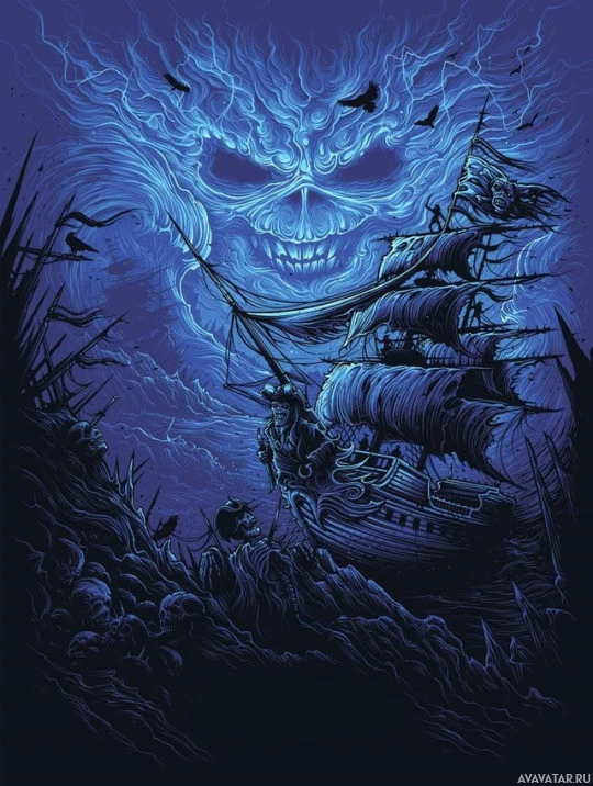 a stormy sea, suggesting a pirate-themed scene. The overall atmosphere is one of danger and the supernatural, possibly related to folklore about ghost ships or haunted seas.