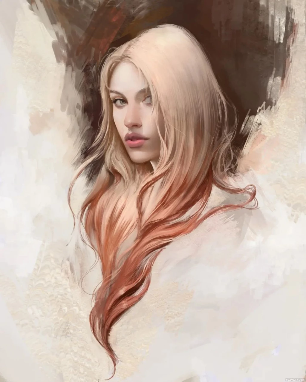 blonde hair. She appears to be looking off to the side, and her expression is serious or contemplative. The background has a textured appearance, suggesting it could be part of