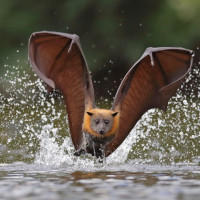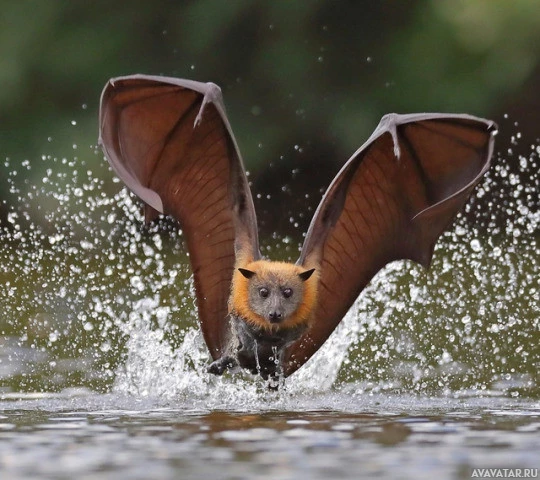 На картинке изображена летучая мышь в полете. Он имеет большие раскидистые крылья и захвачен в середине полета с каплями воды, видимыми вокруг него, предполагая, что летучая мышь летала над водой.