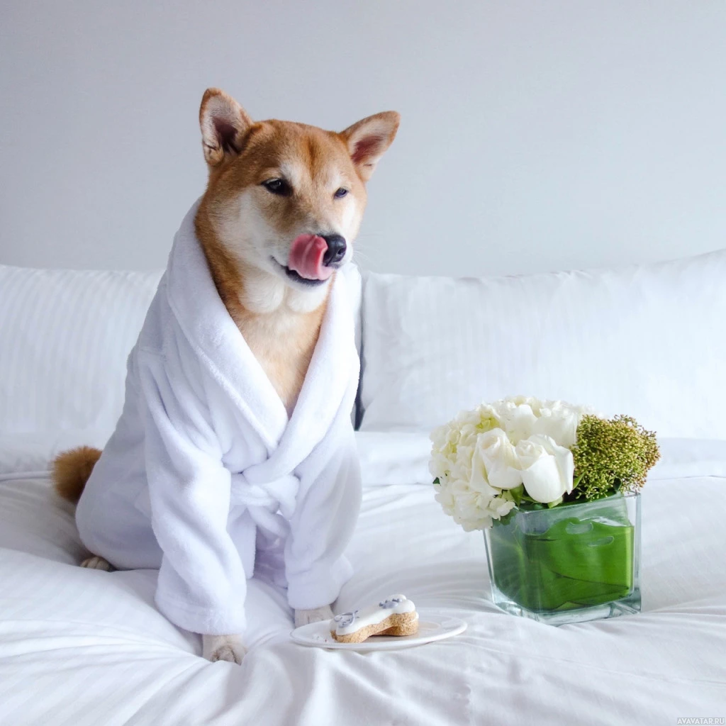 a white robe or coat, giving it a somewhat human-like appearance of being ready for a spa treatment. Next to the dog is a clear vase containing what looks like flowers, which adds