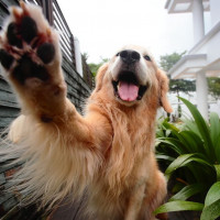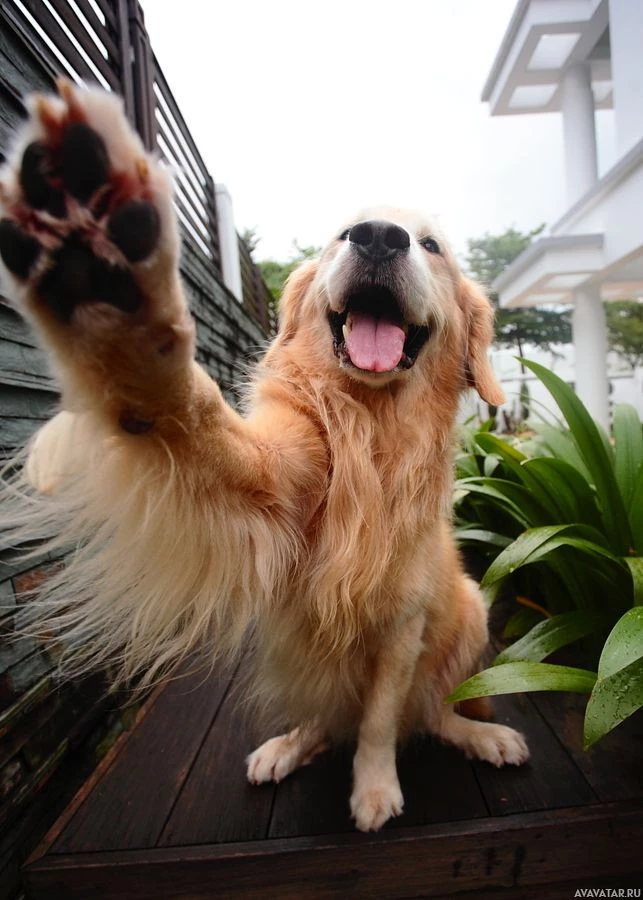 retriever dog sitting on what appears to be an outdoor deck or patio. The dog has one of its