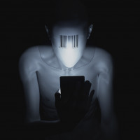 The image depicts a person sitting with their face obscured by a QR code or similar design, which gives the appearance of a black and white mask. They are holding what appears to be a smartphone, possibly taking a selfie. The color scheme is monochromatic with shades of gray dominating the image, contrasting with