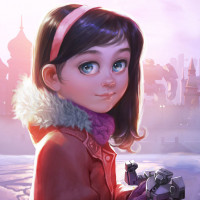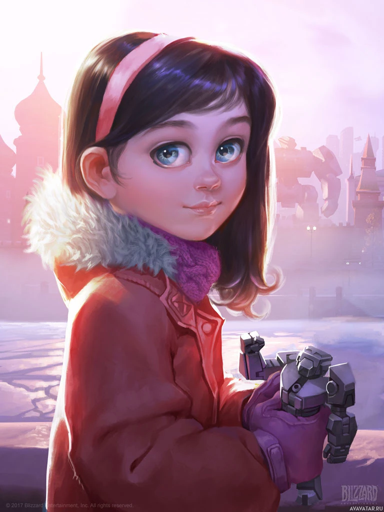 brown hair and is wearing a red coat with a fur-lined hood. Her expression is gentle and she seems to be looking directly at the viewer. On her shoulder, there's a small robotic figure that resembles a character from