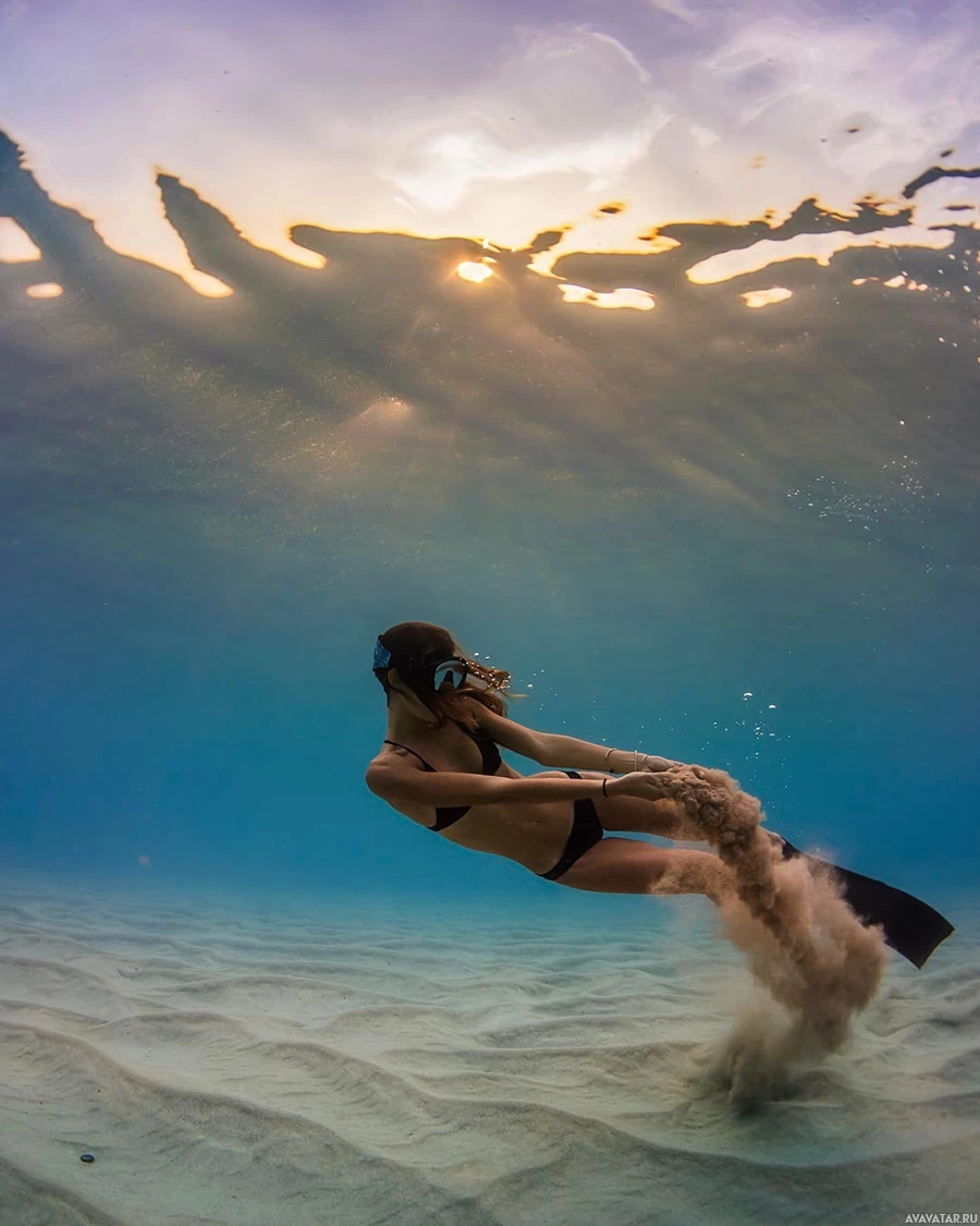 scuba diving or snorkeling. Their fins are visible, kicking up sand as they move through the water. There's also some sunlight filtering through the water, creating rays that illuminate the scene from above. The environment suggests