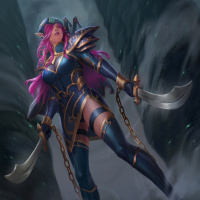 gold accents and a helmet that appears to be part of her ensemble. In each hand, she is holding a sword. The background suggests a dark or foreboding setting, possibly indicating a scene from a fantasy storyline or