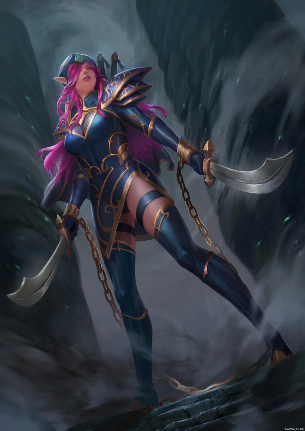 pink hair and is wearing armor with a chainmail skirt. The armor includes