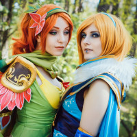 magical abilities to deal damage and support allies. The person on the right appears to be dressed as Windranger from "Dota 2," recognizable by the long