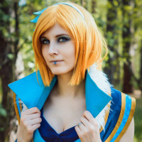 Crystal Maiden, a character from the game Dota 2. The cosplay includes a costume that is predominantly blue and white, with intricate details that represent the character's