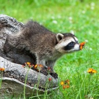 a young raccoon sitting on some grass. It appears to be sniffing the ground, possibly exploring or searching for food. In the background, there is a fallen tree trunk, and the environment suggests