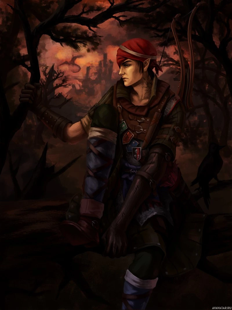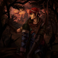 video game. The character is dressed in armor and holding a crossbow, suggesting they might be a hunter or an adventurer of some sort. They are positioned amidst a dark, forested setting with ominous