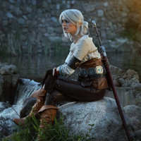 the character Ciri, which includes leather attire with visible straps and buckles. In this scene, she seems to be taking a break from her journey or perhaps waiting for someone or something. The setting appears to be a natural environment that could fit within the game's