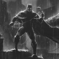 a rocky outcrop during what appears to be rainfall. The character is wearing a cape and cowl that are typical of Batman, with a prominent bat emblem on