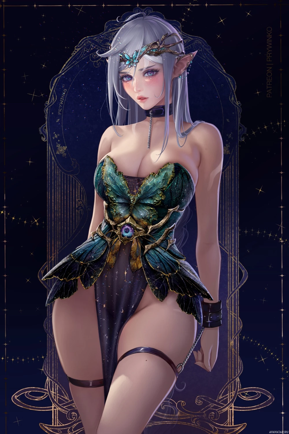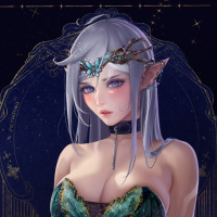 white hair and is adorned with what seems to be an ornate outfit, possibly resembling armor or a costume inspired by mythical creatures such as fairies or nymphs. The background suggests a magical or mystical environment, likely designed to enhance the fantasy theme of the character.