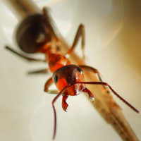 The picture features an insect that can be identified as an ant. It has the characteristic reddish-brown color with a smaller, darker head and antennae. This image captures the detail of the ant's face and antennae, which are typical features used to identify different species within the ant family.